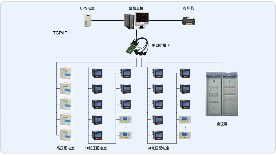 整个系统采用分布式结构,高压配电室、低压配电室1#、低压配电室2#内现场设备均采用RS485总线直接接入监控主机扩展卡的串口。对于每个回路采用ACR多功能仪表,共126个回路;站控层应用国内知名的联想商用计算机作为监控主机,同时设有用于报表打印输出的打印机;防止异常断电而引发的数据丢失的UPS设备。监控软件平台采用单机版Acrel-3000型电能管理系统。Acrel-3000型电能管理系统预留了扩展接口,可方便进行扩展。