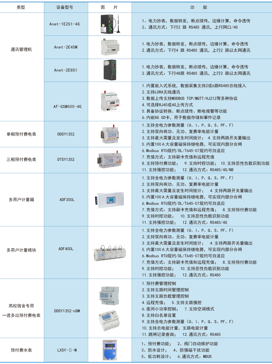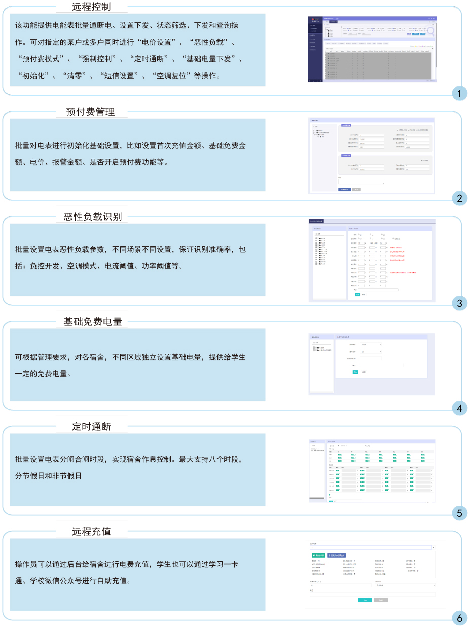 高校宿舍预付费电控系统集电能计量、收费管理、用电过程管理等功能于一体,具备远程实时抄表计量、控制学生作息、恶性负载识别预警、校园一卡通自助缴费、微信查询、打印用能报表等功能,创建节约校园、安全校园,方便校方进行一体化、信息化管理,并支持和智慧校园系统的数据对接。