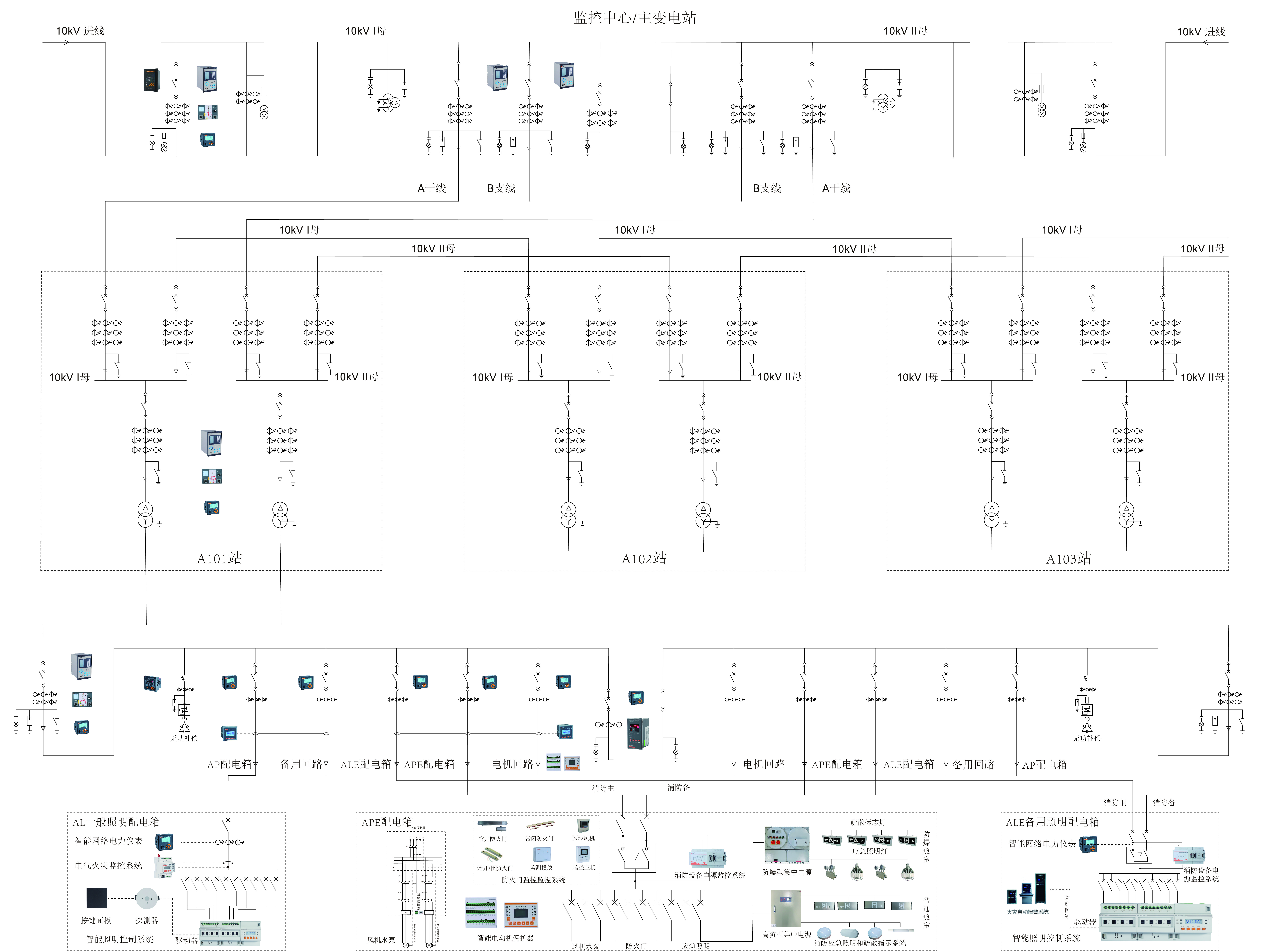 电力监控系统主要针对管廊变电站、开闭所和10/0.4kV配电房,对电源进线配置电能质量监测装置实时监测进线电能质量,包括电压闪变、跌落、电压合格率等数据生成电能质量分析报告。高压回路配置微机保护装置进行保护和监控,对配电房0.4kV出线配置多功能计量仪表,用于测控出线回路电气参数和用能情况。同时对变电站(所)内重要设备如柴油发电机、无功补偿装置、有源滤波装置、状态进行监测。