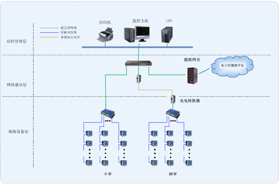 根据上海虹口区的相关能耗导则,现针对虹口区的两个变电所实现能耗的实时监控,并按照区域能耗平台的数据要求,将虹口足球场的用能分为空调用电、照明插座用电、动力用电以及特殊用电,将以上数据不间断上传至虹口区能耗平台。