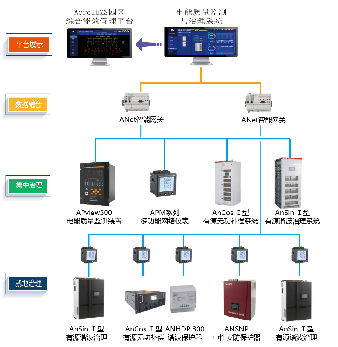为了消除配电系统谐波对配电系统设备的影响,方案配置安科瑞AnSin有源滤波器和AnCos有源无功补偿装置,滤除电网2~31次谐波干扰,提高系统功率因数。