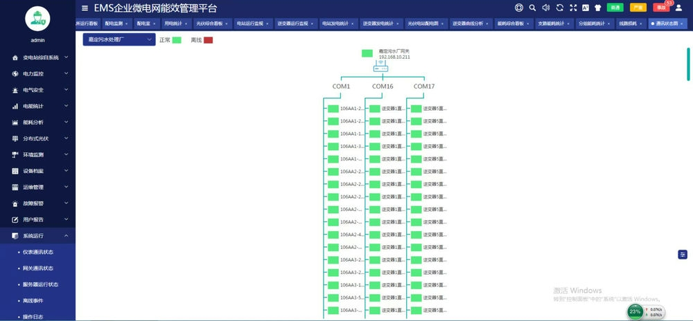 嘉定污水处理厂EMS电能管理系统项目分为三个低配间,两个箱变和光伏设备,做到数据互通,电力数据实时显示在电力一次图上面。