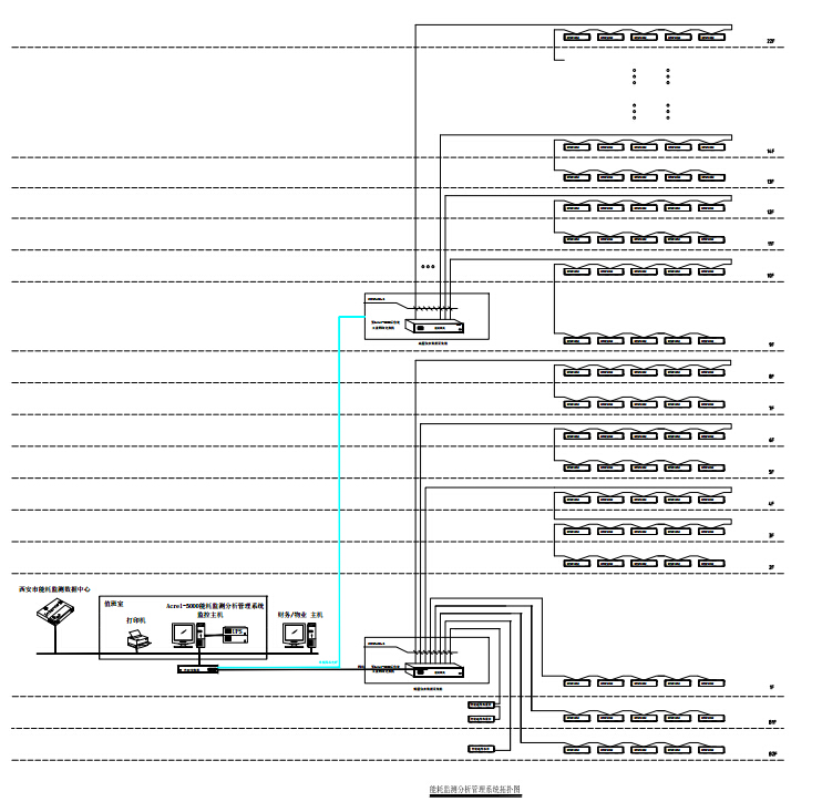 办公主楼地上二十二层,地下两层,合计102块西安旌旗电子的直接接入型电能表,6块安科瑞电气的PZ96L-E4电能表,32块安科瑞电气的PZ72L-E4电能表,1块RS485接口Modbus通讯协议的水表需要进行能耗监测。后台位于一层的值班室内,因此针对本项目的性质,设计一套能耗系统,并在值班室内操作台处配置一台通讯管理机,对地下配电室的安科瑞电表、远传水表以及裙楼及办公楼低层的西安旌旗电子电能表进行采集。同时在9层弱电间再设置一台内置通讯管理机的数据采集箱,对高层部分的西安旌旗电子电能表进行采集,从9层采集箱至1层值班室操作台处后台主机通过光纤进行数据传输。电表及水表的数据采集后按照能耗分类分项原则进行分析,同时根据西安市公共建筑能耗监测系统技术规范DBJ61/T 97-2015将数据上传至西安市公共建筑能耗监测平台。