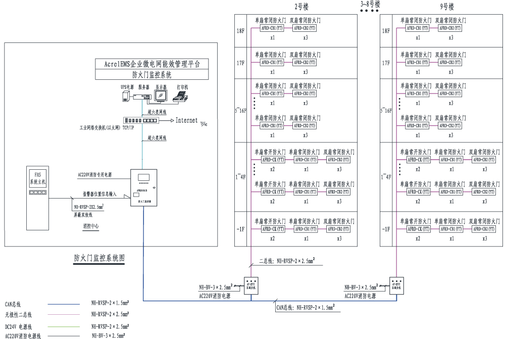AFRD100防火门监控系统,是根据国家现行规范标准由安科瑞电气股份有限公司研发的全数字化独立运行的系统,已通过国家消防电子产品质量监督检验中心的消防电子产品试验认证,并且均通过严格的EMC电磁兼容试验,保证了该系列产品在低压配电系统中的安全正常运行,现均已批量生产并在全国得到广泛地应用。该系统通过对电动闭门器、电磁释放器、门磁开关等进行信号采集及控制,实现了防火隔离和防烟,并根据用户的需求,还可以与AcrelEMS企业微电网管理云平台或电气火灾自动报警系统等进行数据交换和共享。
