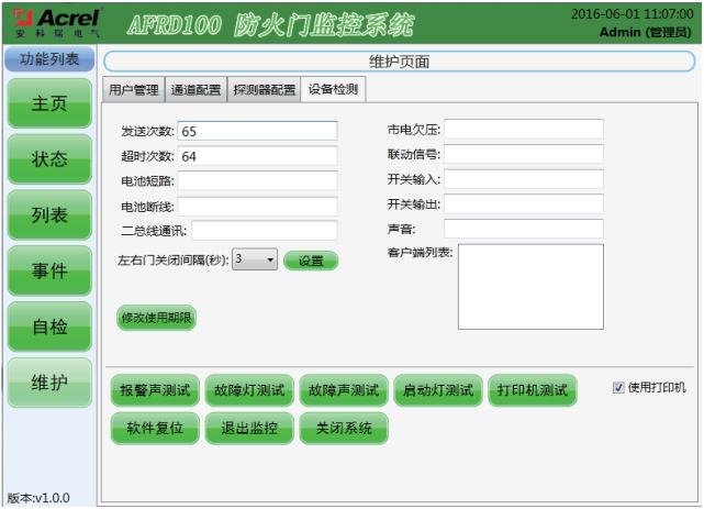 该界面可以直接查看和设置一些系统运行参数,独立测试监控器部分功能,但只有“管理员”及其以上级别才有操作权限。