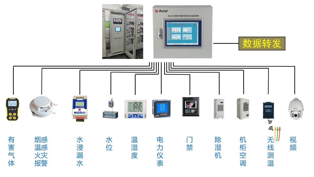 Acrel-2000E配电室综合监控系统,可实现开关柜运行监控、高压开关柜带电显示、母线及电缆测温监测、环境温湿度监测、有害气体监测、安防监控,可对灯光、风机、除湿机、空调控制等设备进行联动控制。实现动力环境各数据的检测与设备控制,优化动力环境,避免运行环境的失控导致配电设备运行故障,保证维护人员安全,延长设备使用寿命,实现配电动力环境的分布式远程管理。