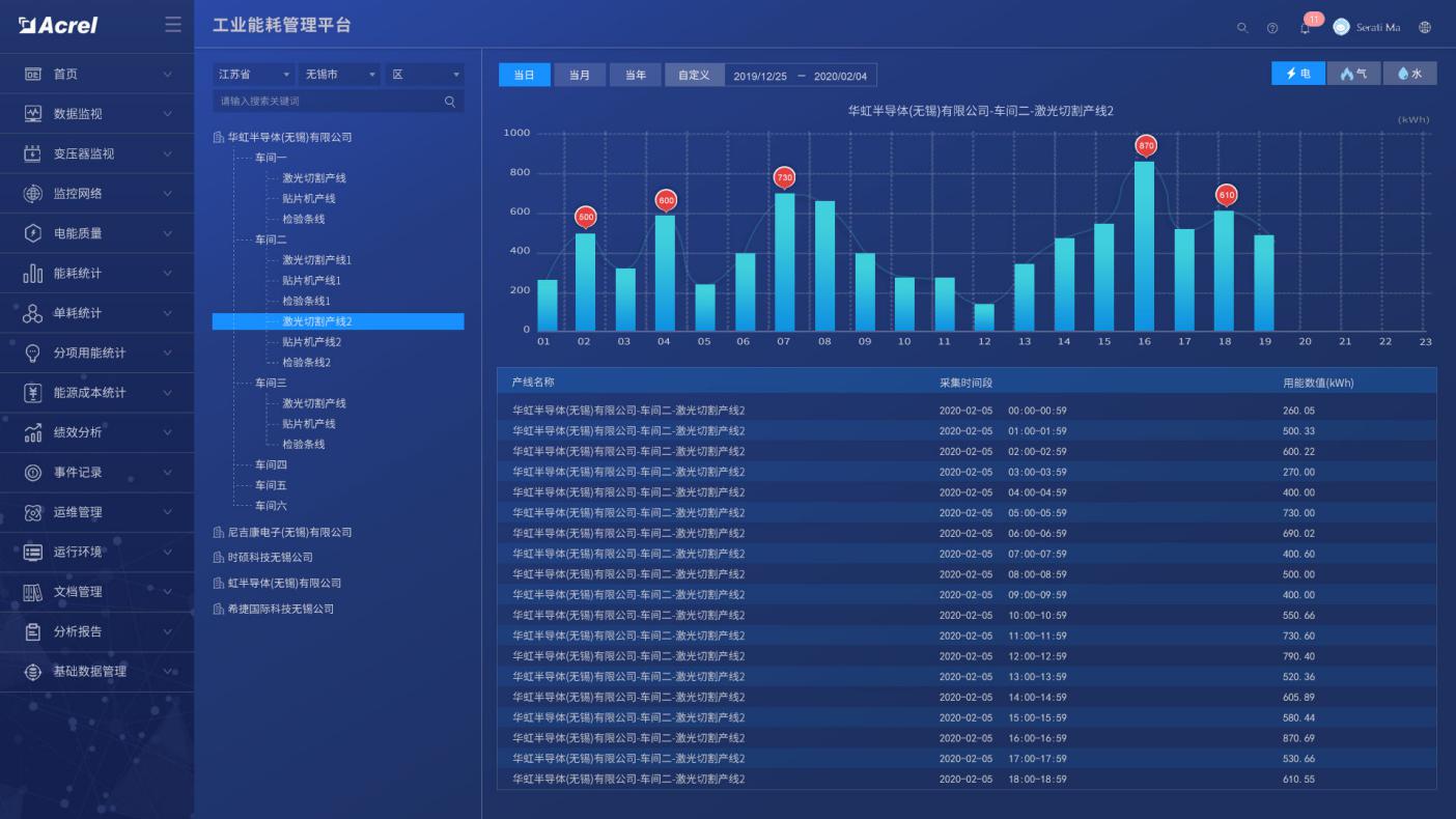 系统对区域、工段、设备能源消耗进行数据采集,监测重点设备及工艺运行状态,如温度、湿度、流量、压力、速度等,并支持变配电系统一次运行监视。可直接从动态监测平面图快速浏览到所管理的能耗数据,支持按能源种类、车间、工段、时间等维度查询相关能源用量。