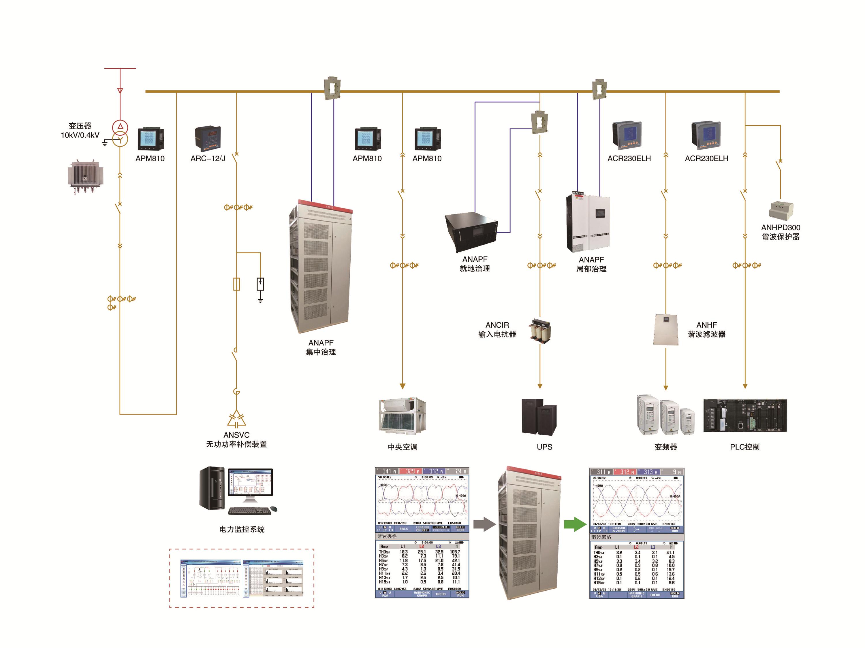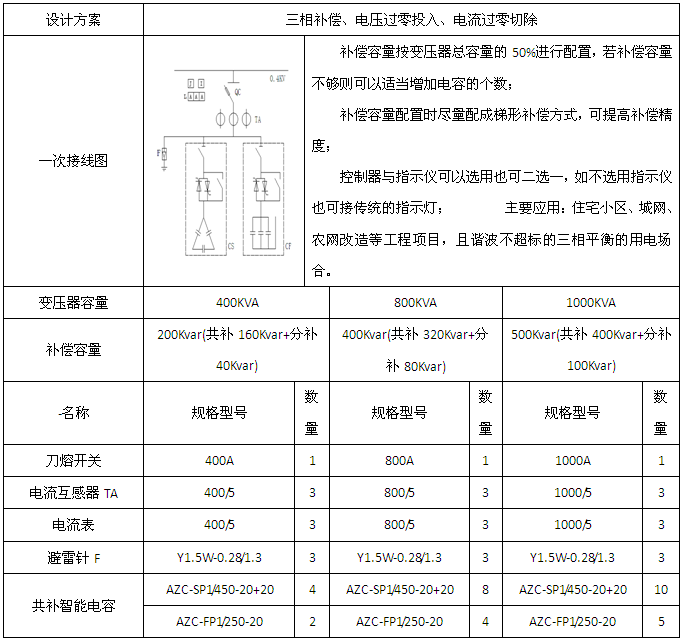 1、变压器容量为400/800/1000/1250/1600/2000KVA的三相补偿应用方案。