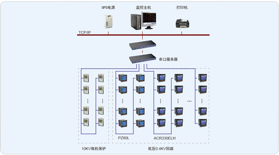 10kV回路的进线和馈线配有微机保护装置;0.4kV进线和母联回路装有ACR330ELH电网质量分析仪,采集回路的常规电参量、四象限电度和电网质量参数;0.4kV馈线回路装有PZ80L系列多功能电力仪表,采集回路的常规电参量和四象限电度。本系统仪表集中,所以均通过屏蔽双绞线手拉手相连数据上传至监控主机。