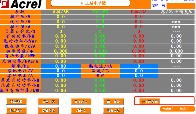 触摸屏开启后的第一个界面为主路参数界面,如果有多路进线,可点击右下角的按钮切换查看其它进线的参数。