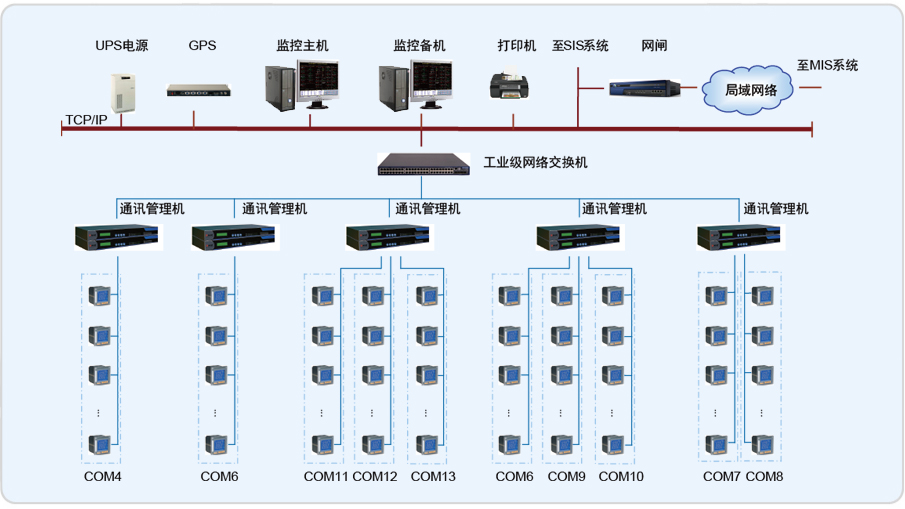 为了能实现对电厂电能量数据进行自动采集、远传和存储、预处理、线损统计及分析的电能综合管理平台,合肥电厂电能量管理系统采用了Acrel-3000电能管理软件,通过现场总线把现场的电能仪表进行集中管理,做到了自动采集、集中控制、智能管理。同时本电能管理系统还具备同厂内SIS(监控信息系统)以及MIS(管理信息系统)共享。
