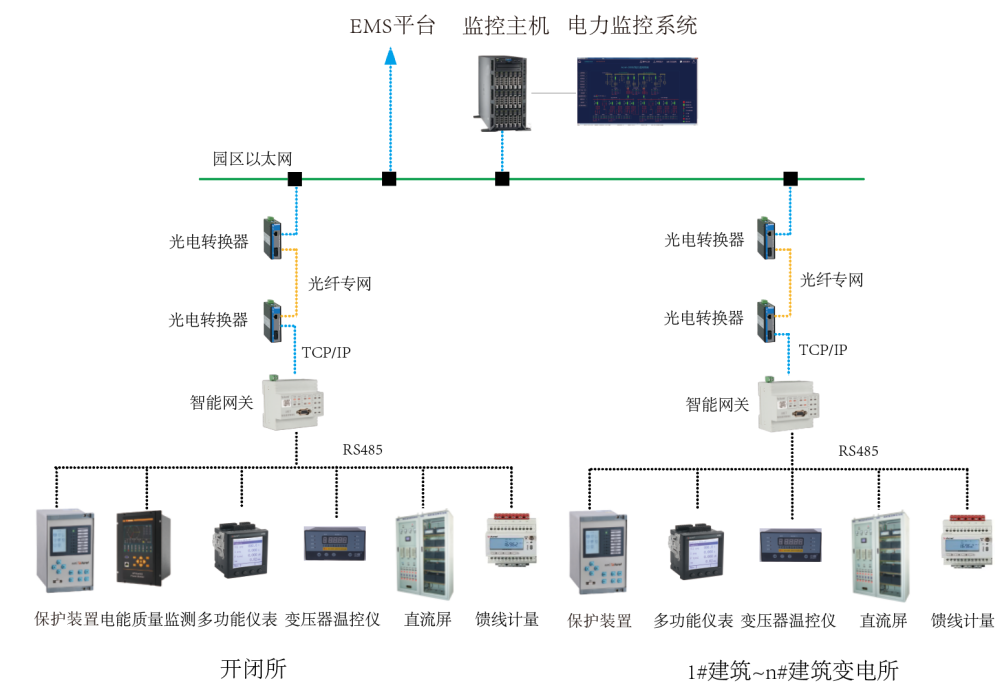 系统采用分布式结构,微机保护装置、多功能仪表、变压器温控器、直流屏、柴油发电机控制屏等设备通过RS485总线或者以太网接入智能网关,经过协议转换、数据处理后上传至电力监控系统,实现遥测、遥信、遥控、异常报警等功能。