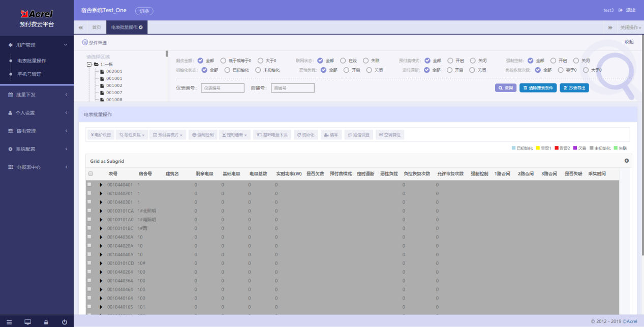 该功能提供电能表批量通断电、设置下发、状态筛选、下发和查询操作。可对指定的某户或多户同时进行“电价设置”、“恶性负载”、“预付费模式”、“强制控制”、“定时通断”、“基础电量下发”、“初始化”、“清零”、“短信设置”、“空调复位”等操作。