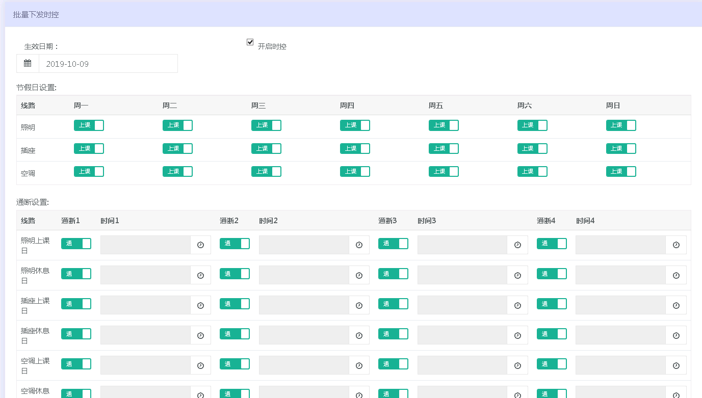 设置工作日和节假日宿舍每天用电通断时间,最多支持八个时间段,三路可以单独设置。