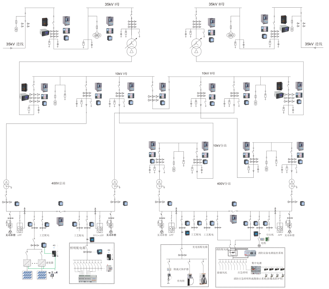系统人机界面友好,以配电一次图的形式直观显示配电线路的运行状态,实时监测各回路电压、电流、功率、功率因数、电能等电参数信息,动态监视各配电回路断路器、隔离开关、地刀等合分状态、柴油发电机状态、柴油液位、UPS状态、电池信息等,以及有关故障、告警等信号。