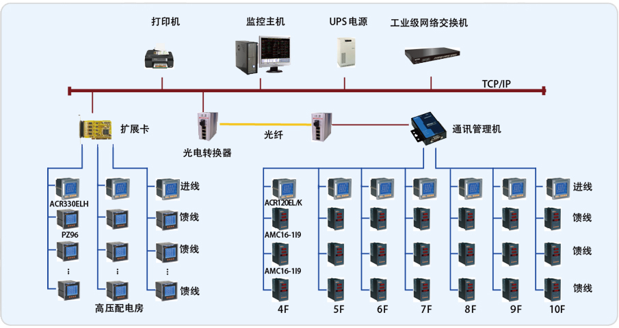 整个系统采用分布式结构,在上海东方电视台变电所监控室放置监控主机及通讯采集装置,现场各回路的仪表采用屏蔽双绞线以总线型方式连接至通讯采集装置,通讯管理机连接至交换机,其中剧场中设备用光纤连接至监控室。