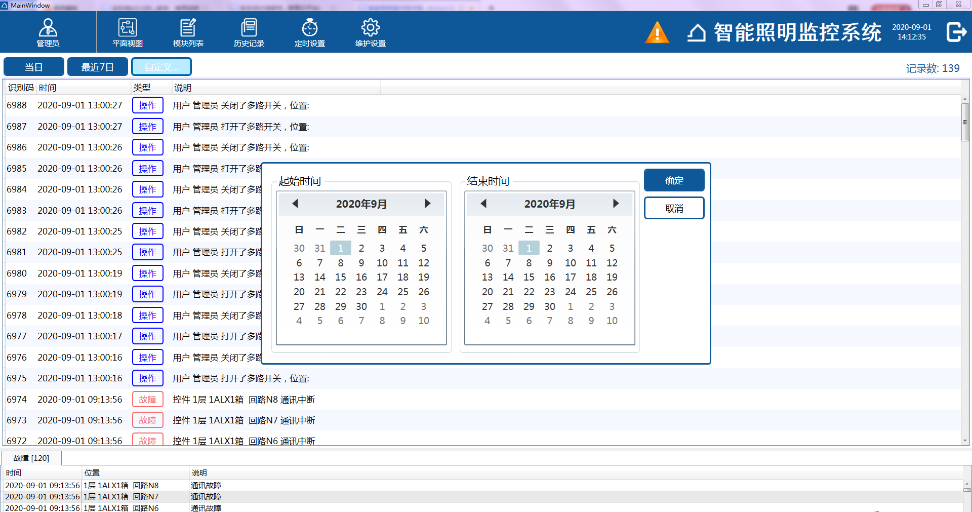 2)当发生模块离线、网关设备掉线或者状态反馈和下发控制命令不一致时会发生故障报警,并将故障报警信息记录并显示在界面中。